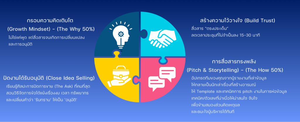 “ปลดล็อก ‘กำแพง’ ในใจ”… เปลี่ยน Mindset ของทีม (IT, บัญชี) จาก ‘ฉันไม่ใช่นักขาย’ ให้เป็น ‘ฉันคือนักแก้ปัญหา’ สร้างความ “อึด” (Resilience) ที่ไม่กลัวการถูกปฏิเสธ